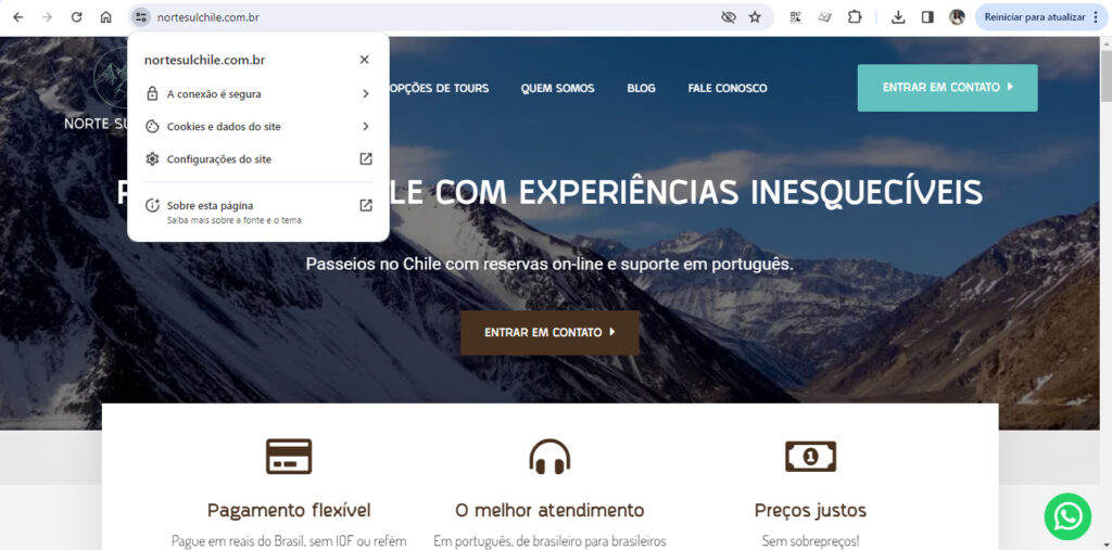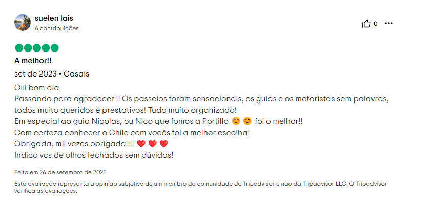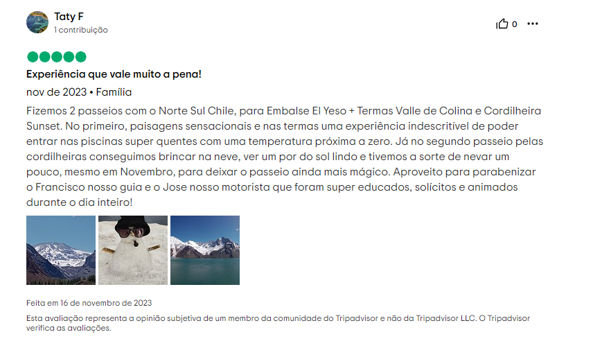 Checamos o perfil da Norte Sul Chile no TripAdvisor, uma plataforma segura e amplamente utilizada pelos viajantes para verificar a reputação de empresas do nicho turístico como agências, hotéis e restaurantes.