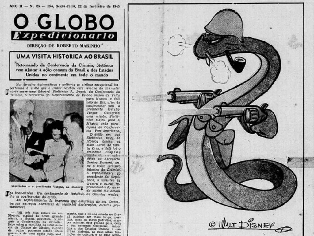 E tem um detalhe curioso que pouca gente sabe: Walt Disney criou uma versão exclusiva dessa “cobra fumante”, publicada no jornal O Globo em fevereiro de 1945.