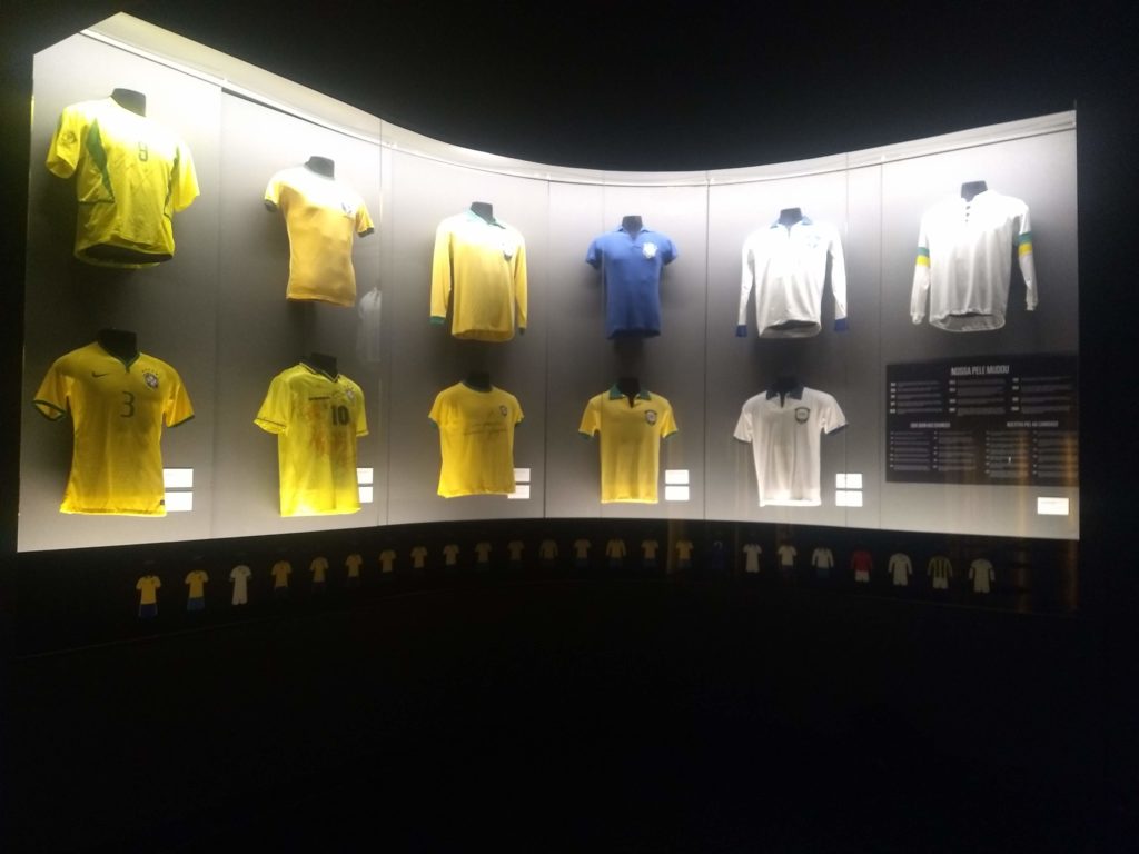 De lá seguimos para a sala Nossa Pele, onde estão expostas algumas camisas já utilizadas pela seleção. Apesar de serem réplicas em sua maioria, algumas foram realmente utilizadas por jogadores icônicos como Raí e Ronaldo, ou contam com histórias engraçadas como o caso da Copa da Suécia de 1958: Nessa edição a final foi realizada entre Suécia e Brasil e as duas seleções tinham o uniforme amarelo, como o Brasil perdeu o sorteio jogou de azul (comprando camisas improvisadas e bordando o brasão retirado das camisas amarelas nas novas camisetas), foi então que o uniforme azul foi utilizado pela primeira vez como segundo uniforme e vem se mantendo assim até os dias de hoje.