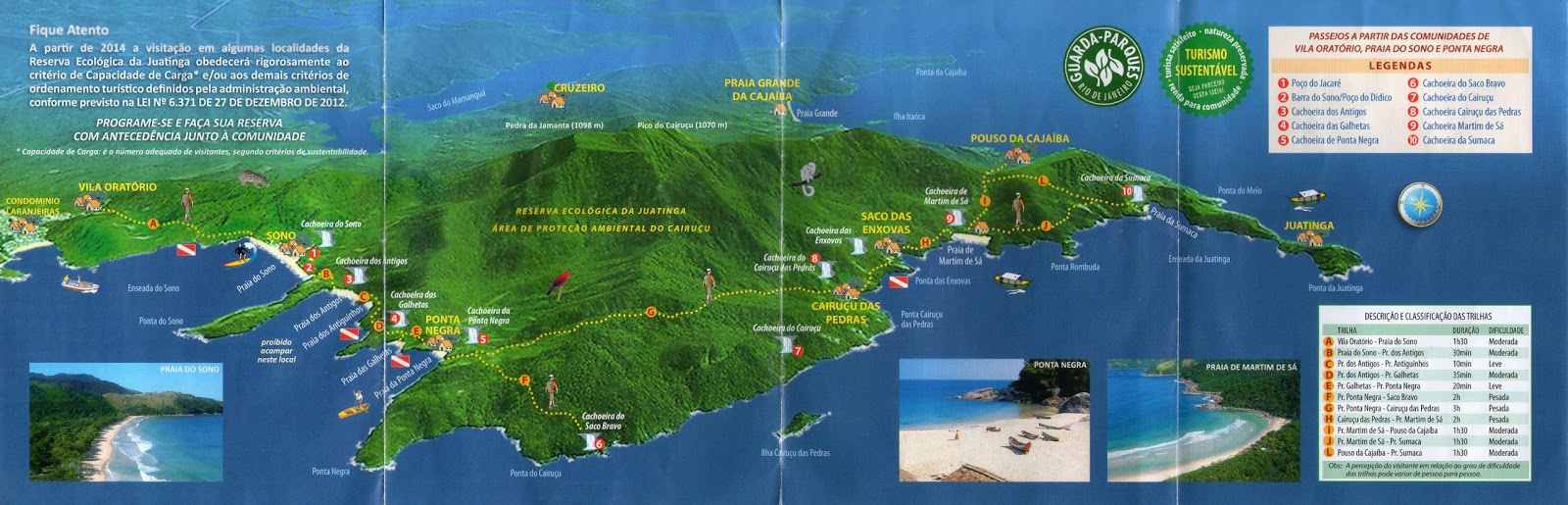 Para quem prefere fazer as trilhas do lado direito da Praia de Pouso da Cajaíba (as mais longas), as mais comuns são as que levam a praia de Sumaca e a praia de Martim de Sá. Para essas duas praias o tempo estimado de trilha é de 1h30 minutos.